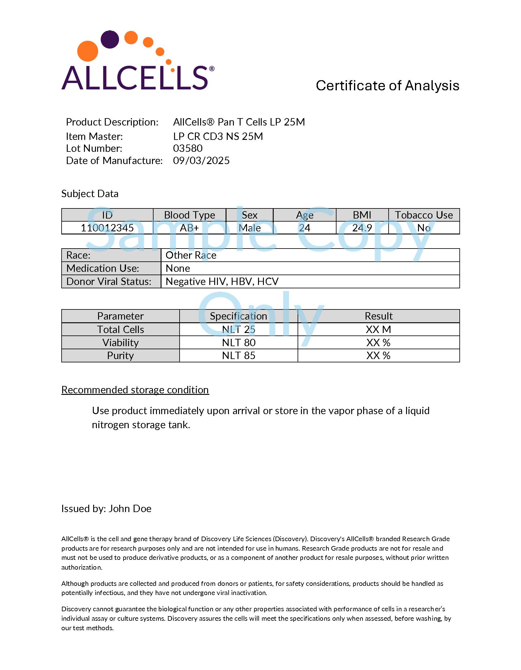 Discovery’s AllCells® Bulk Cell Isolation Services cover a wide range of cell types from single-donor leukapheresis and bone marrow material. Obtain large quantities of quality-controlled cells including CD34+ HSPCs, lymphocyte populations (T cells, B cells, NK cells, and monocytes), and PBMCs for a variety of research and biomedical applications. Contact us for specific donor requests and custom isolation protocols.