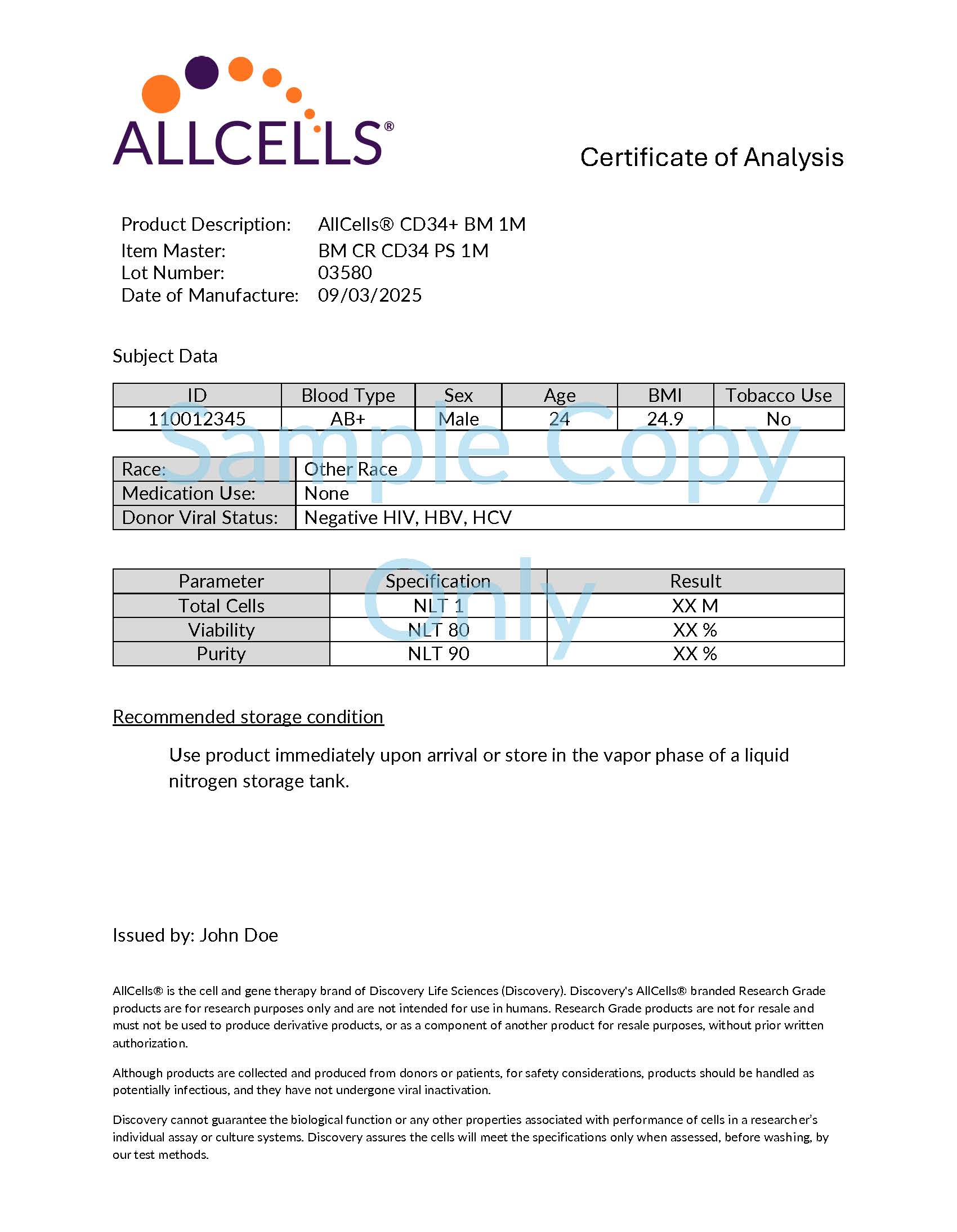 Discovery also offers a large inventory of diseased bone marrow mononuclear cells. Click here for more information.