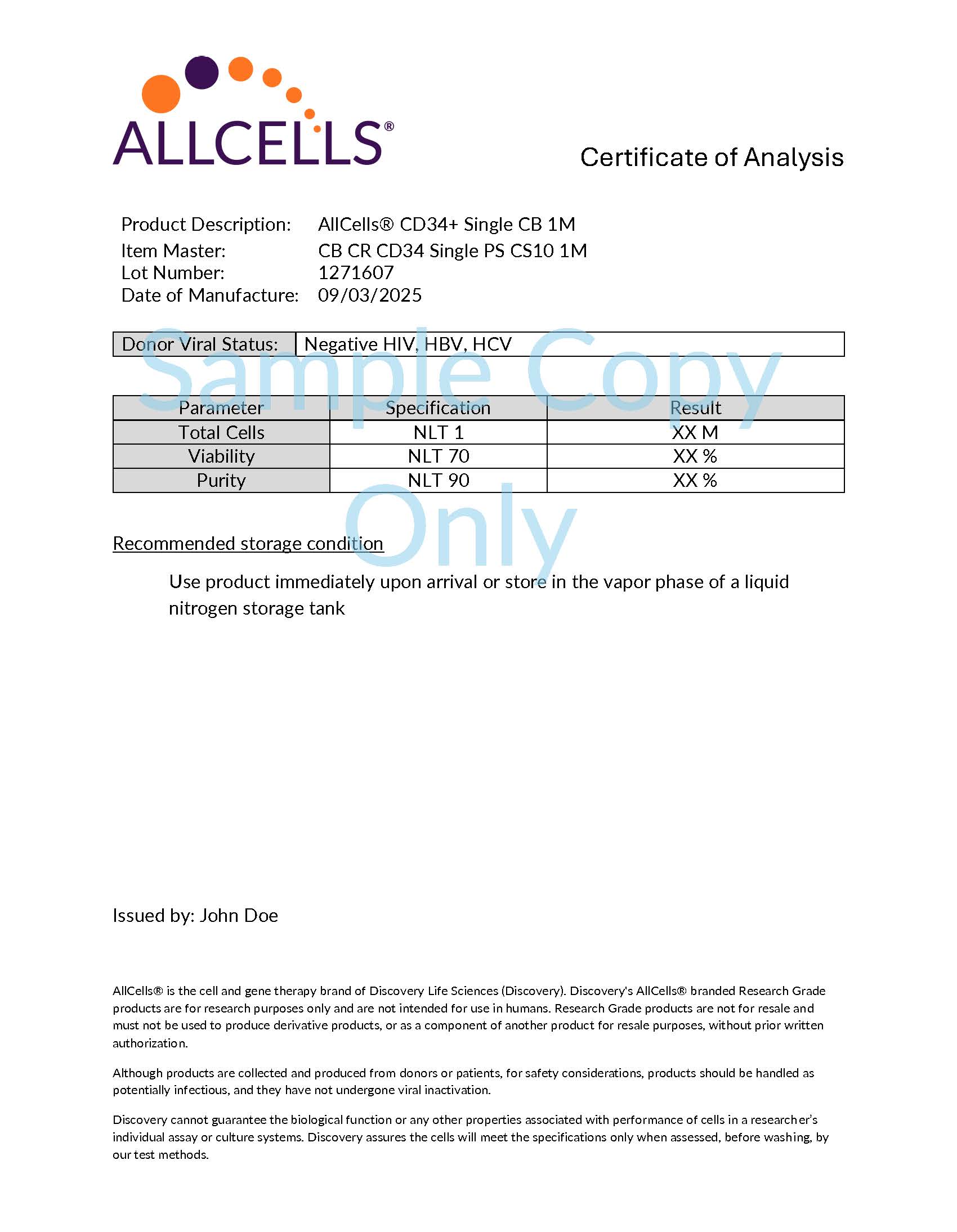 Discovery offers cryopreserved cord blood CD34+ cells from a single umbilical cord and from multiple cord blood units for a mixed donor product in cryopreserved 1M vials. Our Customer Success Team is always happy to provide assistance. Need immediate help? Chat with a live agent now.